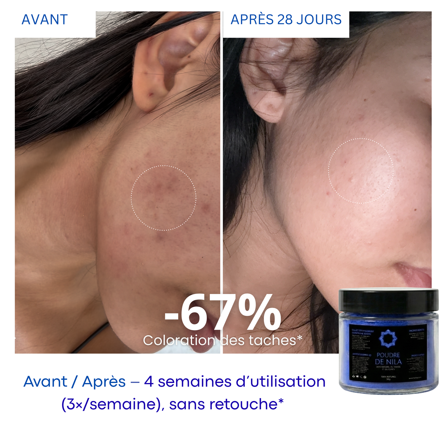 Non ! la poudre de Nila est issue d’une roche minérale 100% naturelle, simplement transformée en fine poudre. Elle ne contient aucun produit chimique ni agents dépigmentants agressifs et respecte l’équilibre naturel de la peau.