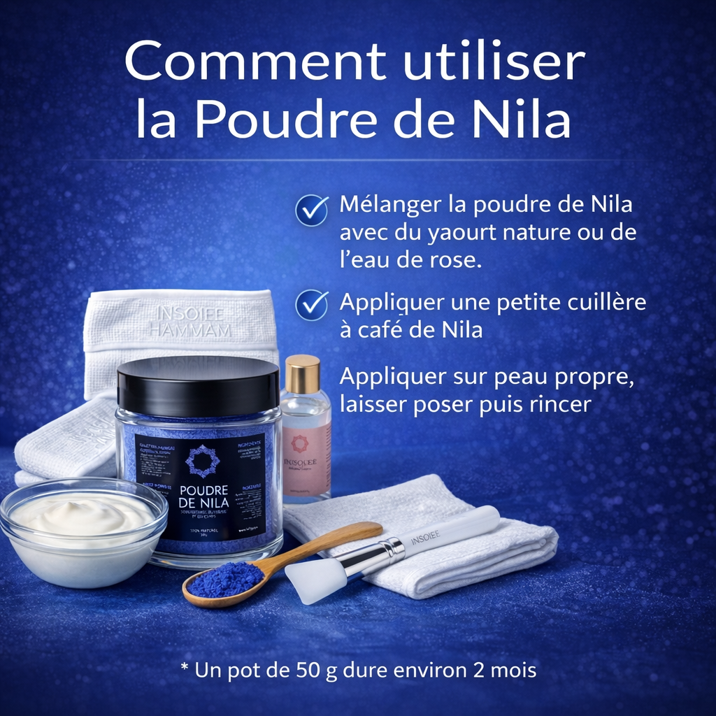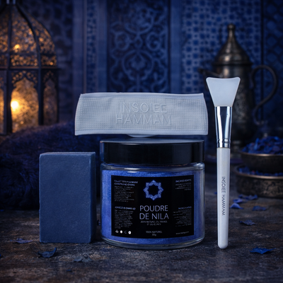 Utilisée depuis des siècles dans les rituels de beauté sahraouis, la poudre de Nila est un minéral naturel rare, reconnaissable à sa teinte bleu indigo. Extraite des régions désertiques du Maroc puis finement broyée, elle est aujourd’hui devenue un secret de peau lumineuse de plus en plus recherché.