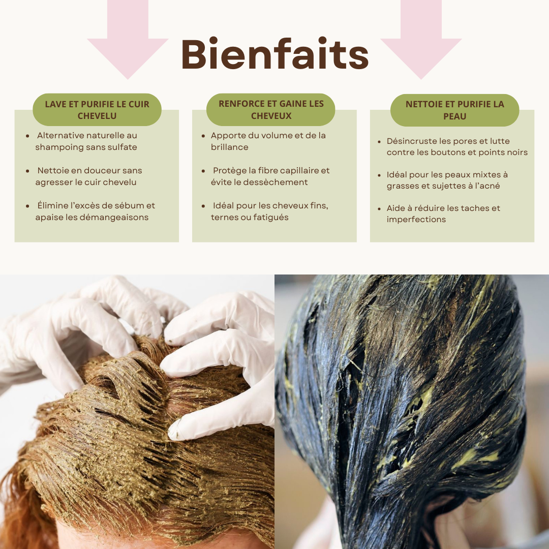 ➤ Mode d’emploi : Mélanger avec de l’eau tiède jusqu’à obtention d’une pâte. Appliquer sur cheveux ou peau, laisser poser puis rincer abondamment.