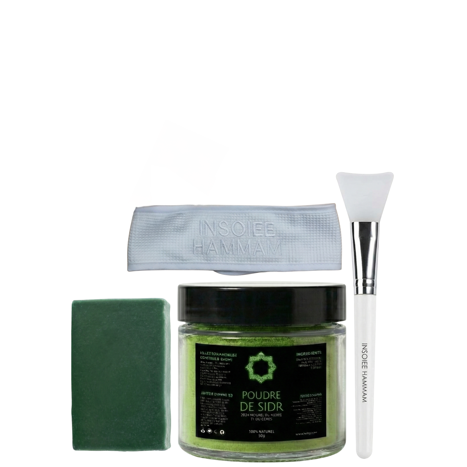 Poudre de Sidr ( jujuba) – Obtenue à partir des graines de la plante de Jujubier, reconnue pour ses vertus apaisantes et régénératrices pour la peau.
